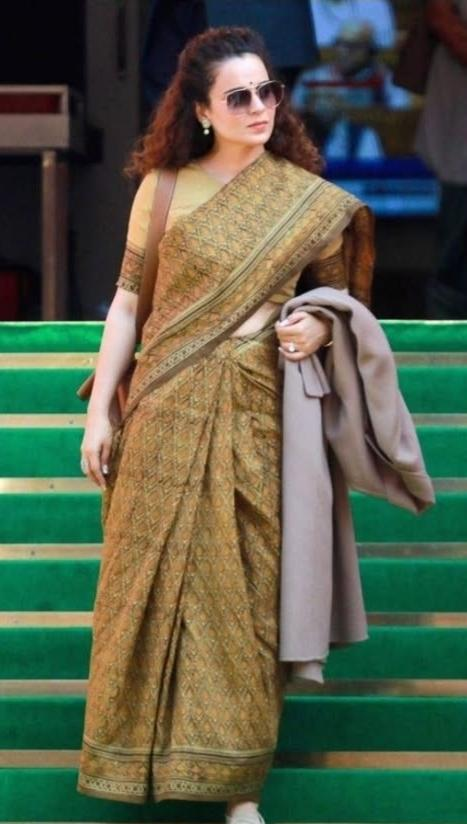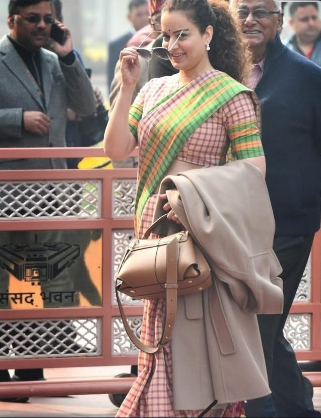 Kangana’s styling is deliberate yet understated. She often pairs her woollen coats with handloom sarees in subtle tones, soft checks, or silk textures. In one Parliament session, she wore a silk saree with an embroidered border, layering it with a tailored black coat and securing it with a leather belt. The ensemble balanced grace and authority — traditional at its core but sharp in presentation.