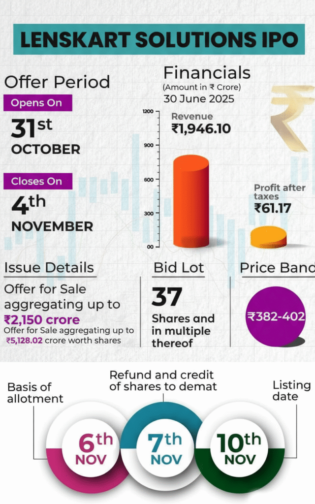 The Lenskart IPO is open for subscription from October 31 to November 4, 2025, with a price band of ₹382–₹402 per share. The company aims for a valuation of around ₹69,700 crore at the upper price limit.
