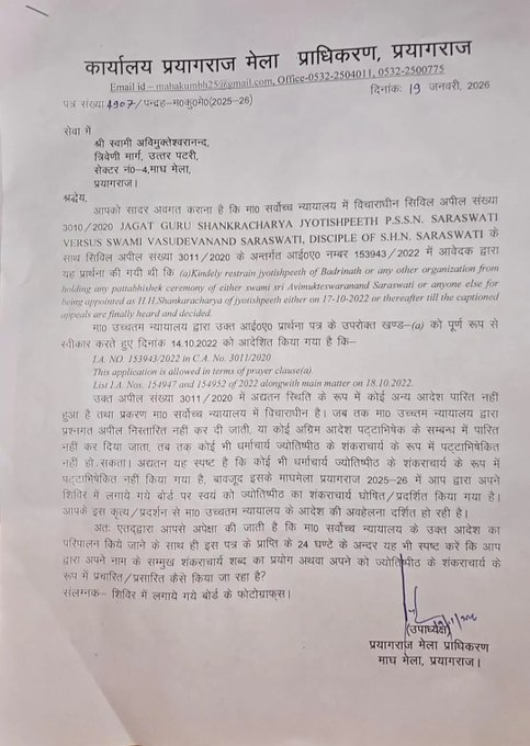 According to the administration, displaying the title “Shankaracharya” on camp signboards without an officially recognized pattabhishek (ceremonial enthronement) amounts to a violation of the apex court’s directions.